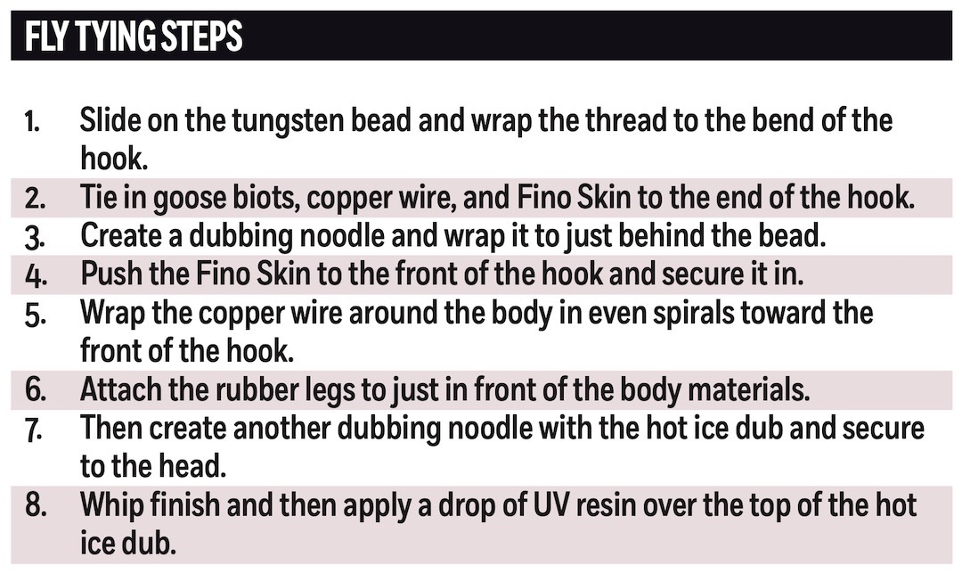 Casing: Brown goose biot Wire: Medium copper wire Hackle: Black Fino Skin Legs: Chartreuse barred rubber legs