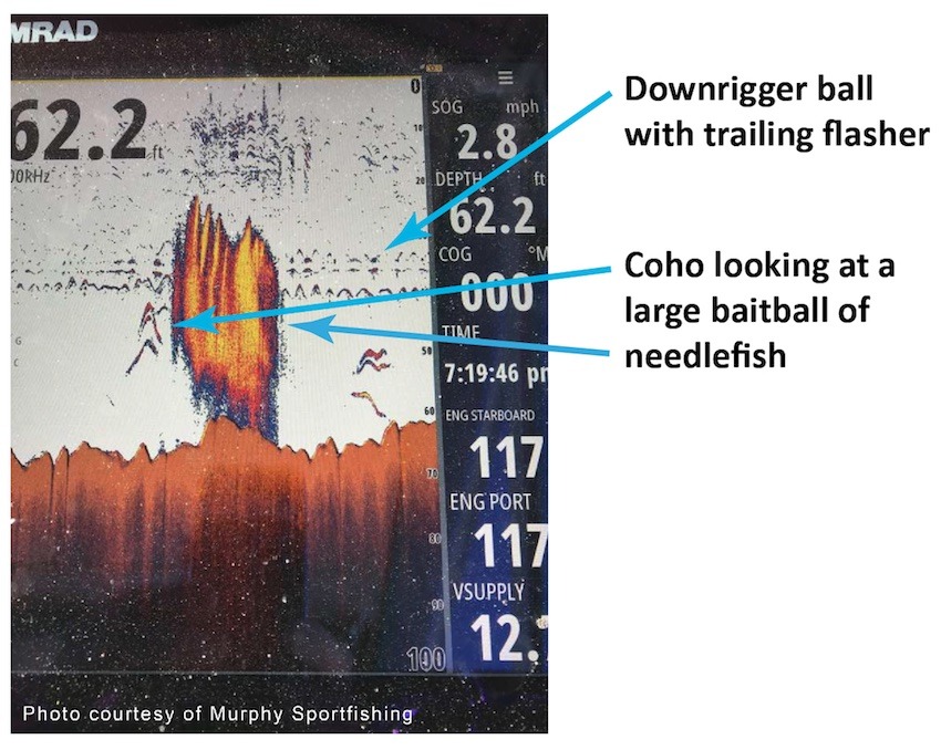 Coho looking at big baitball of needlefish (Photo Courtesy of Murphy Sportfishing)